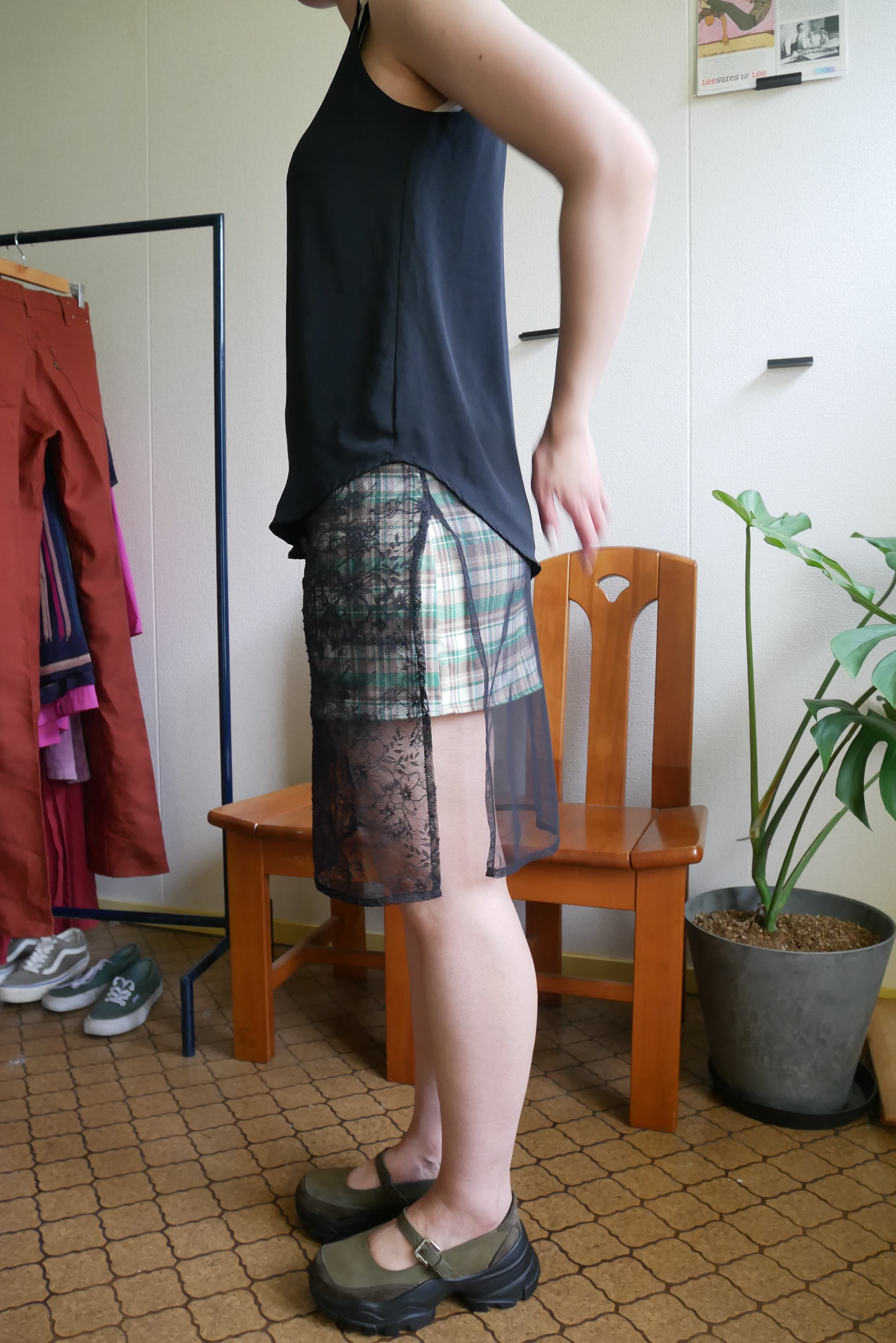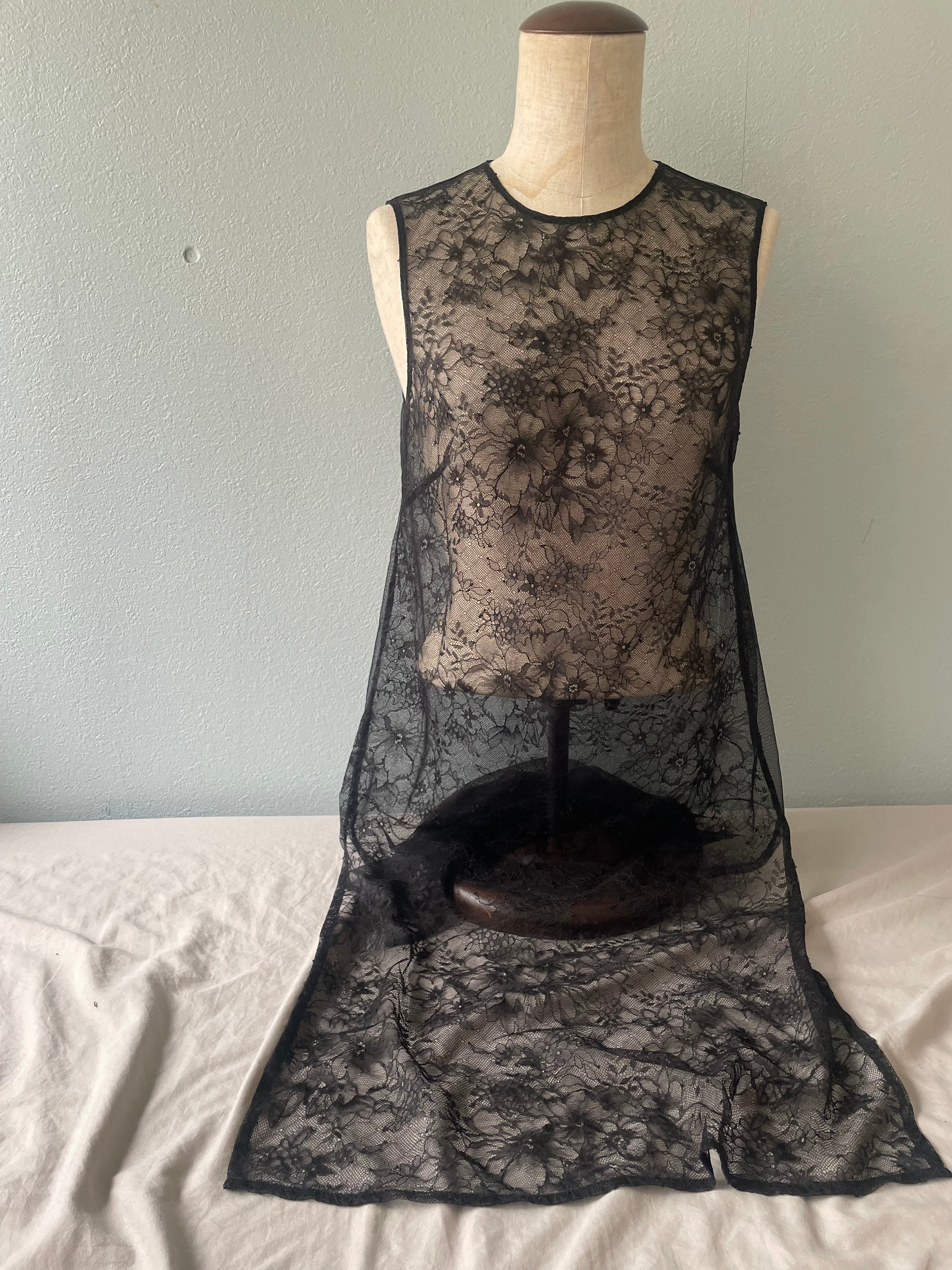 変わり種レイヤードアイテムです。 甘めのアイテムはブラックでバランスを。 繊細なレースは美しい透け感です。 恐らくナイトウェアだったのではないかと思います。 たっぷりの着丈はインパクト◎ オールシーズン活躍する万能アイテムです。 幅広い着こなしを是非お楽しみ下さい。 肩幅 32㎝ 身幅 36㎝ 着丈 88㎝ SIZE・素材表記無し 着用モデル 153㎝