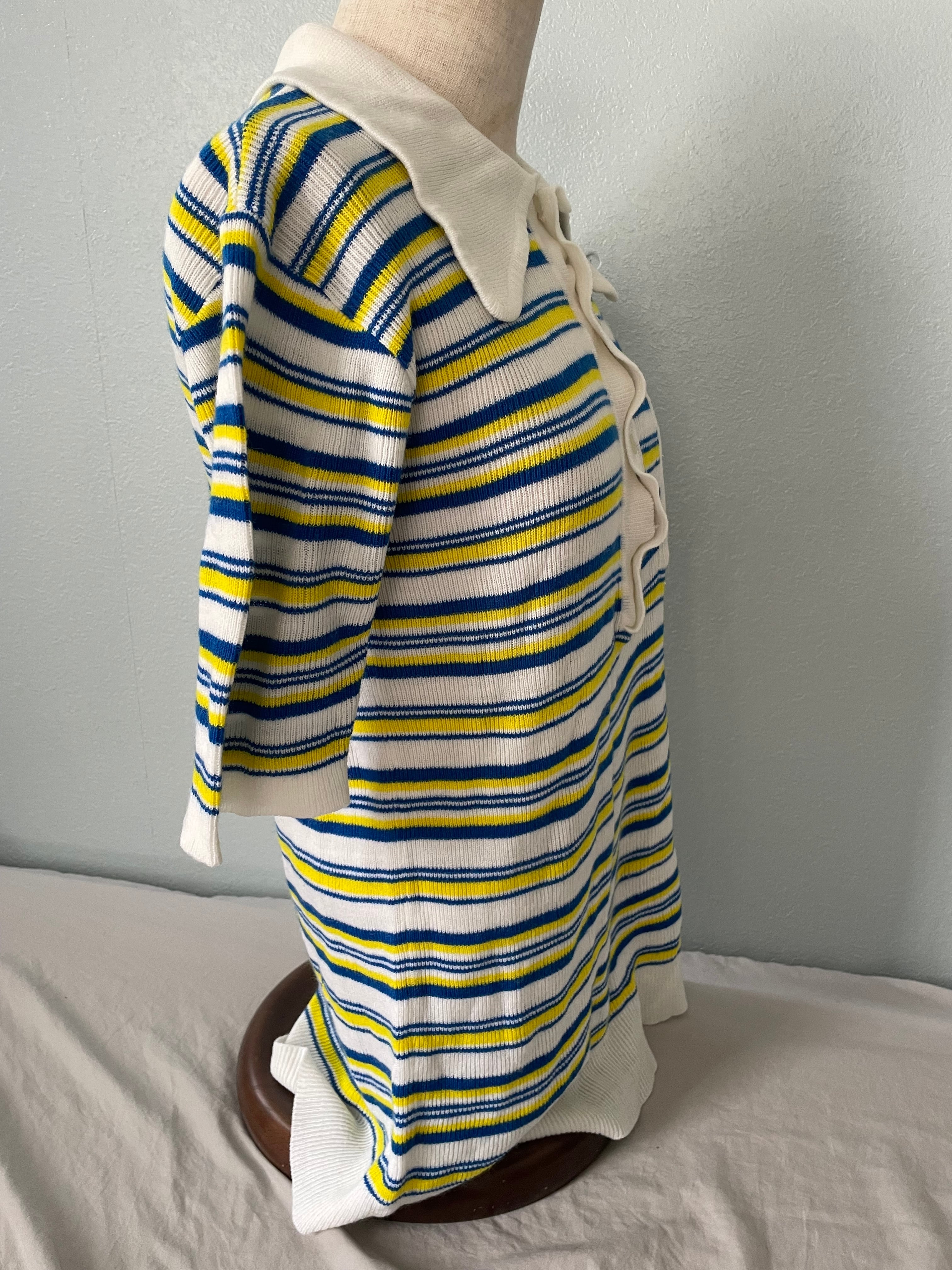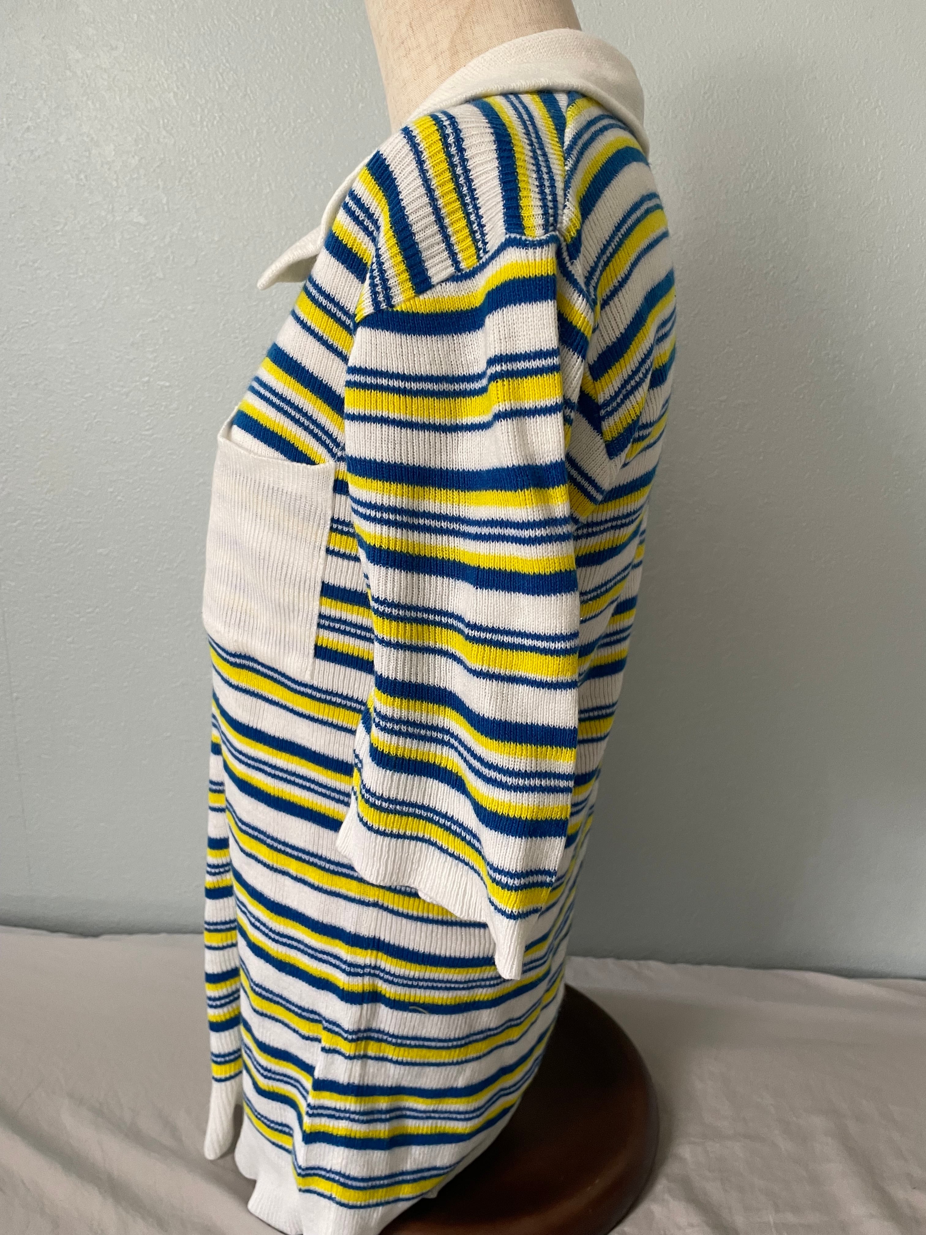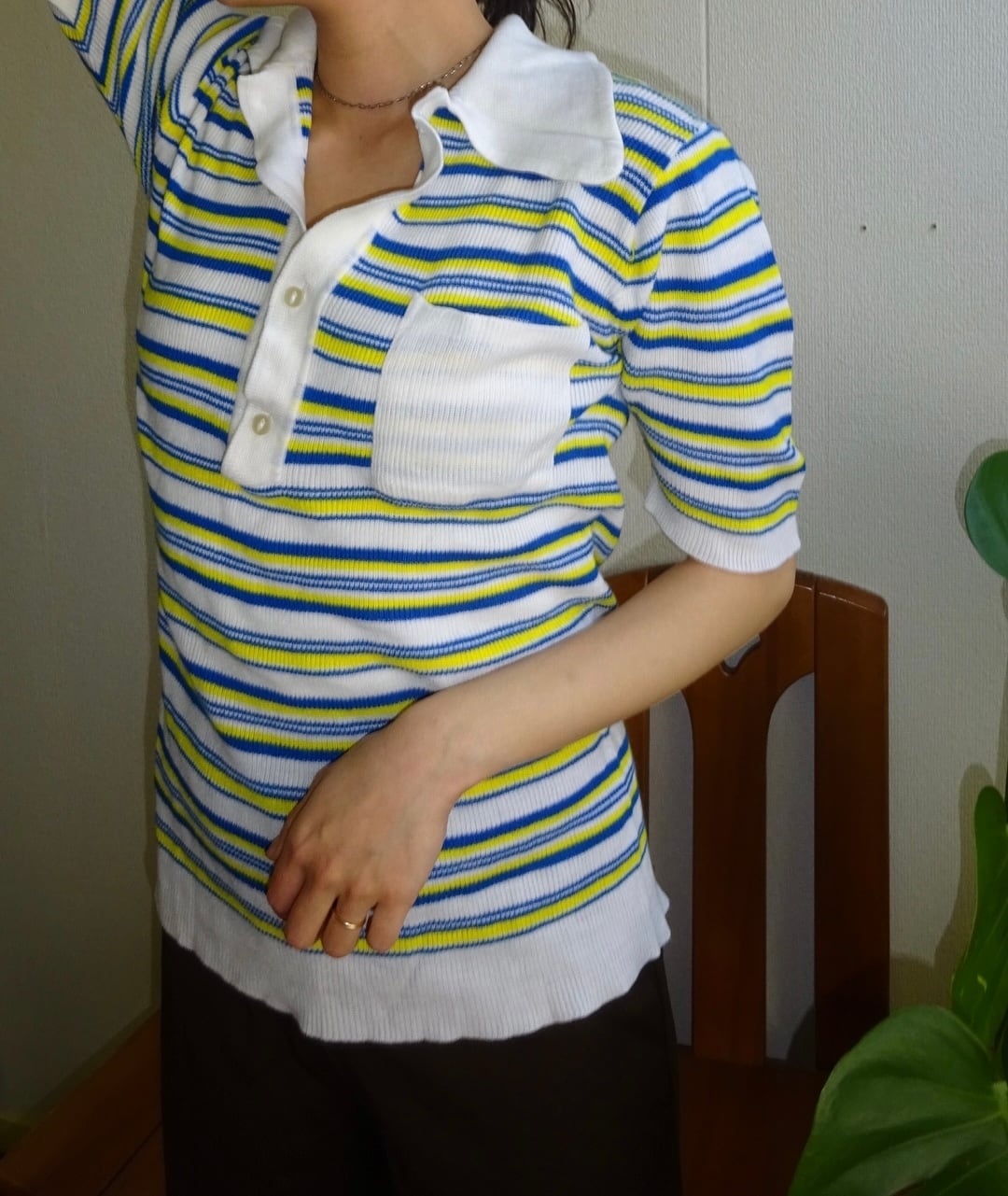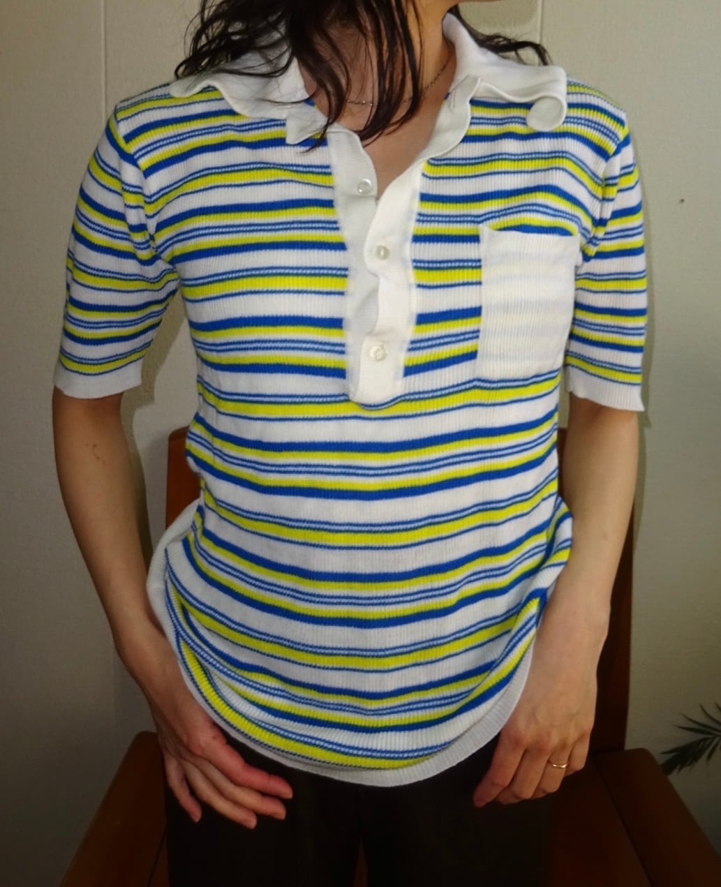 鮮やかなブルーとイエローのマルチボーダーが目を惹く、ヴィンテージニットポロ。