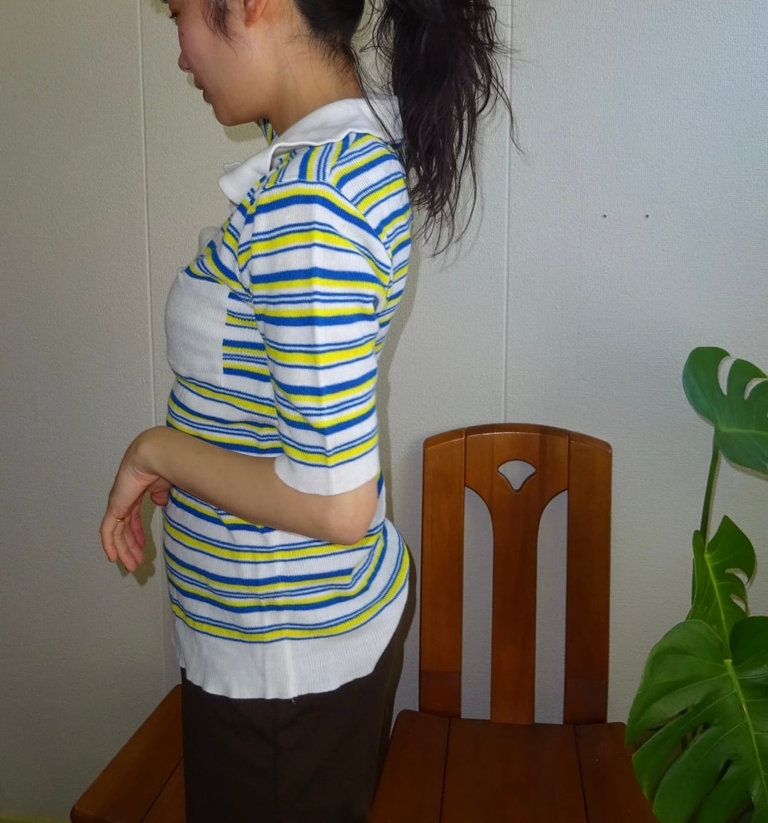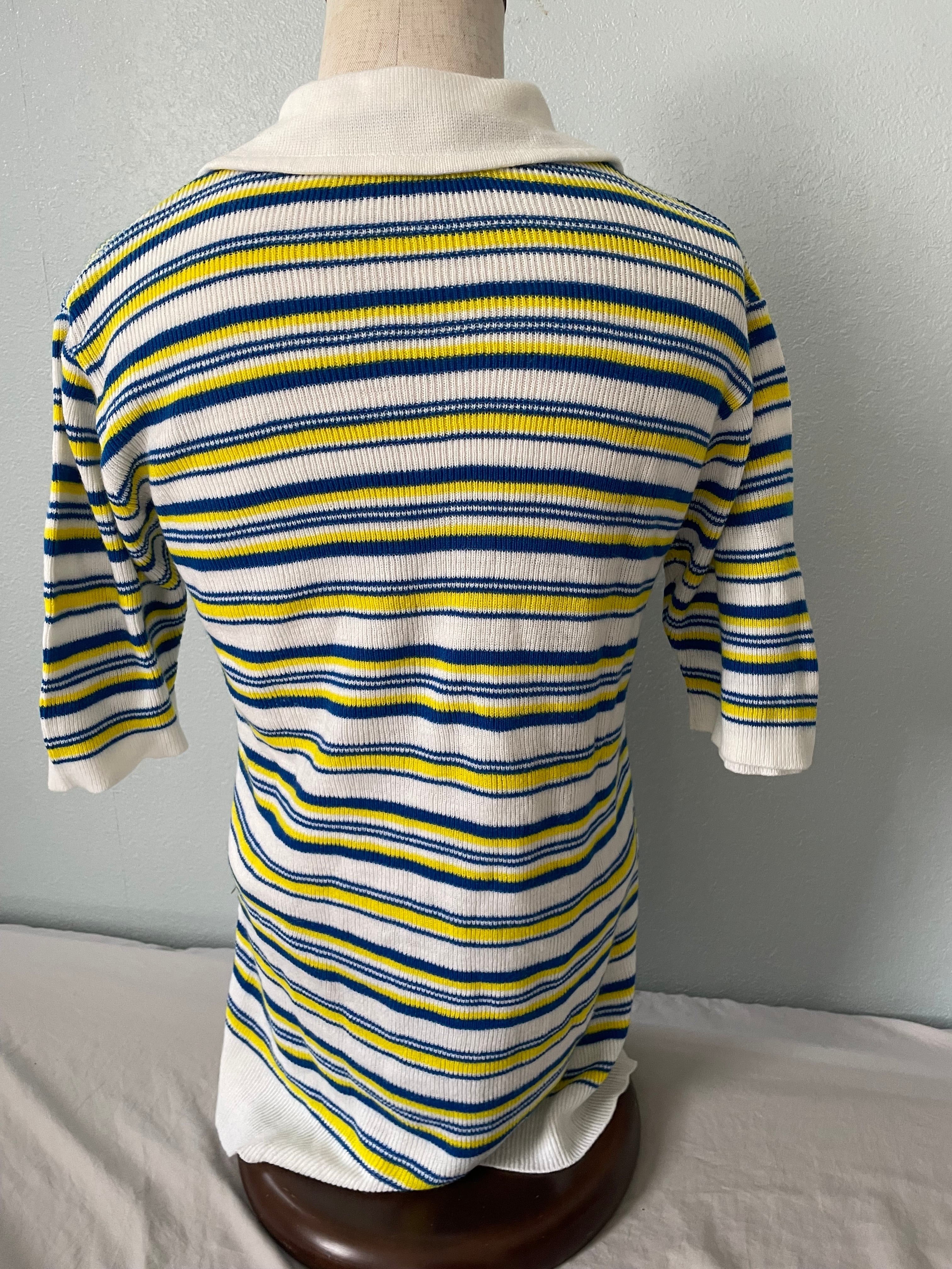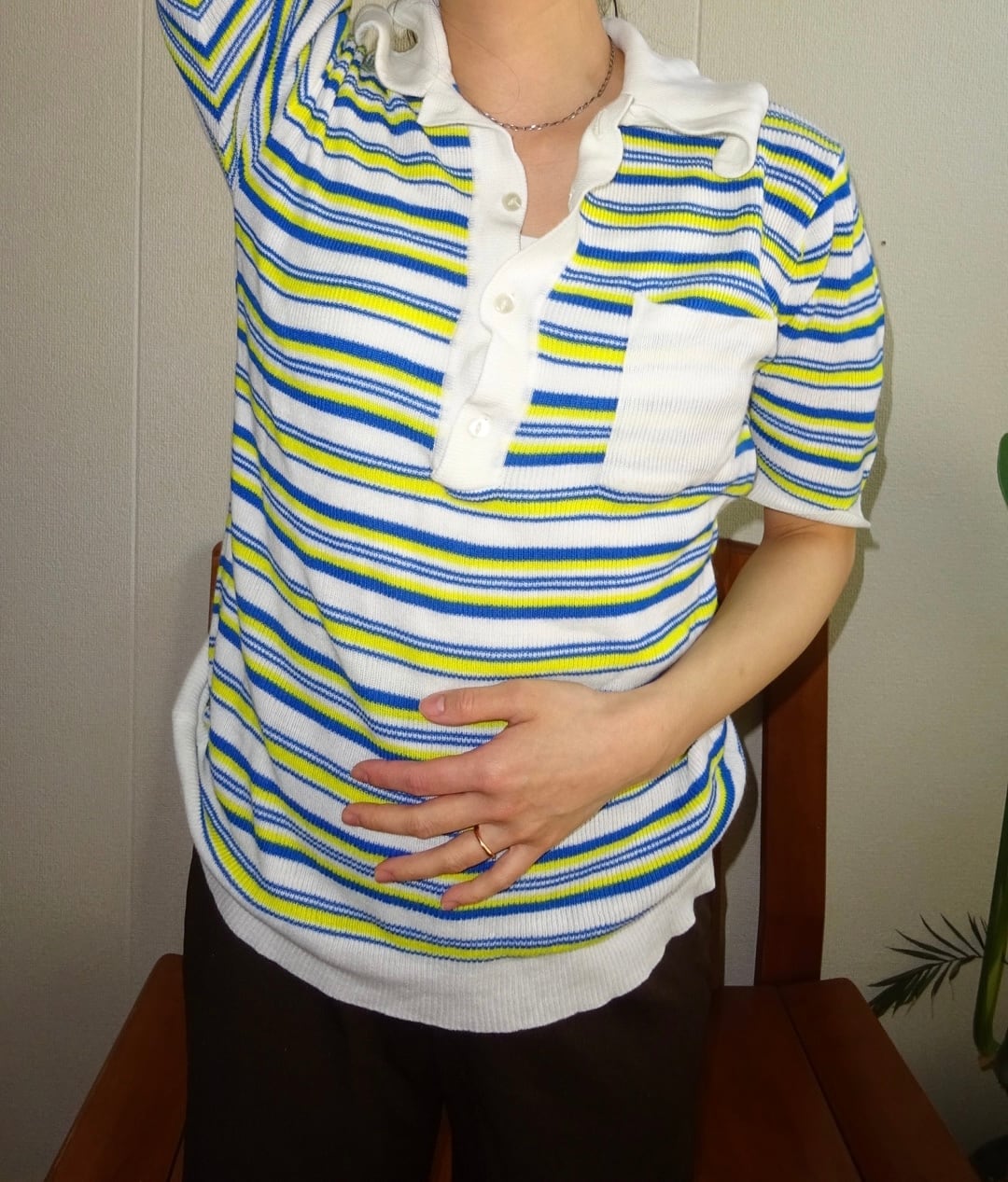 鮮やかなブルーとイエローのマルチボーダーが目を惹く、ヴィンテージニットポロ。