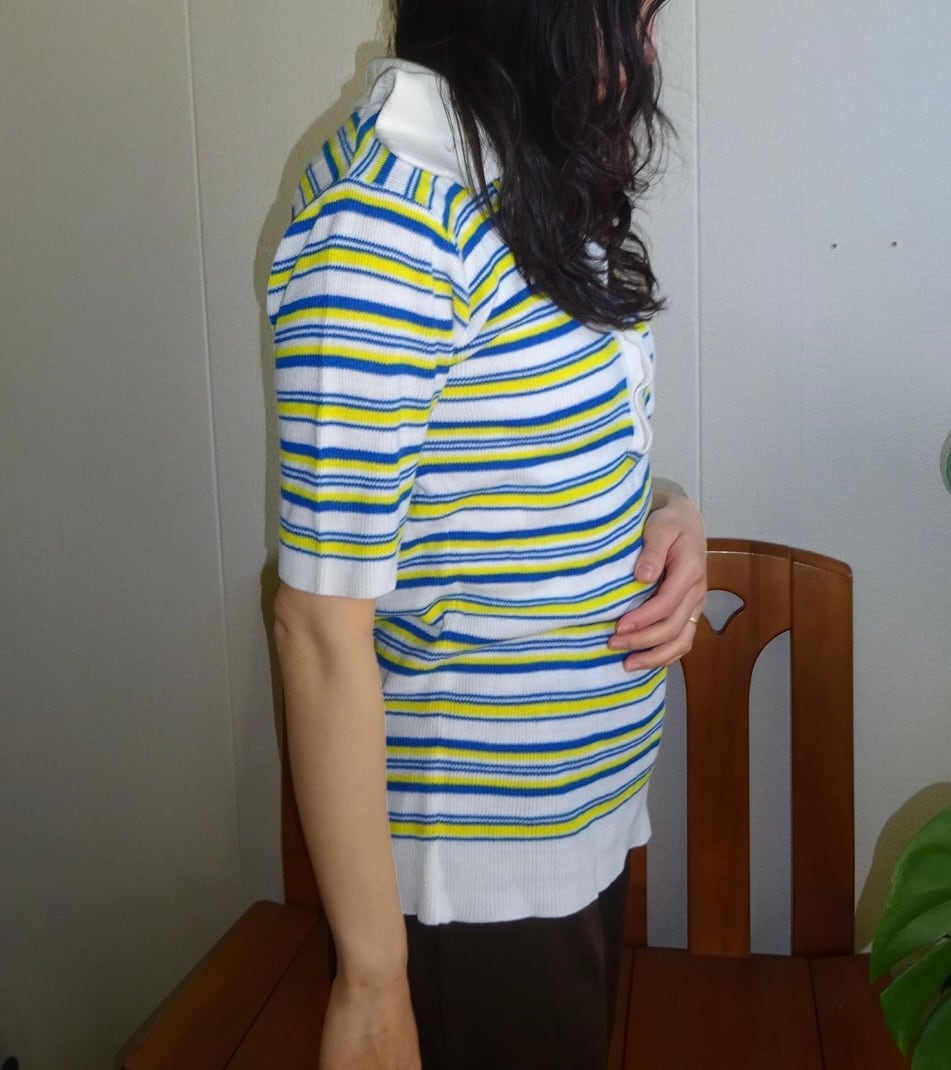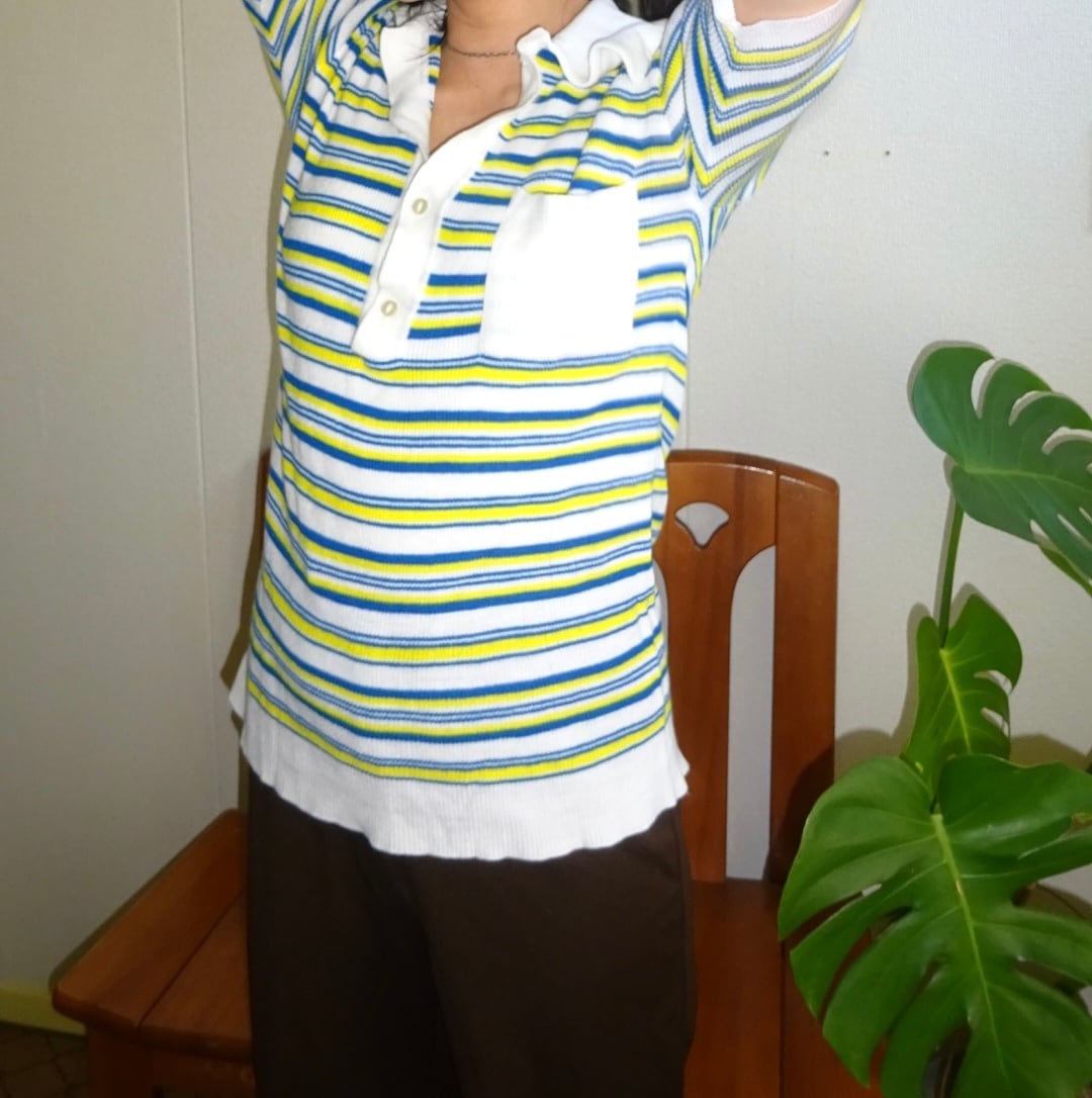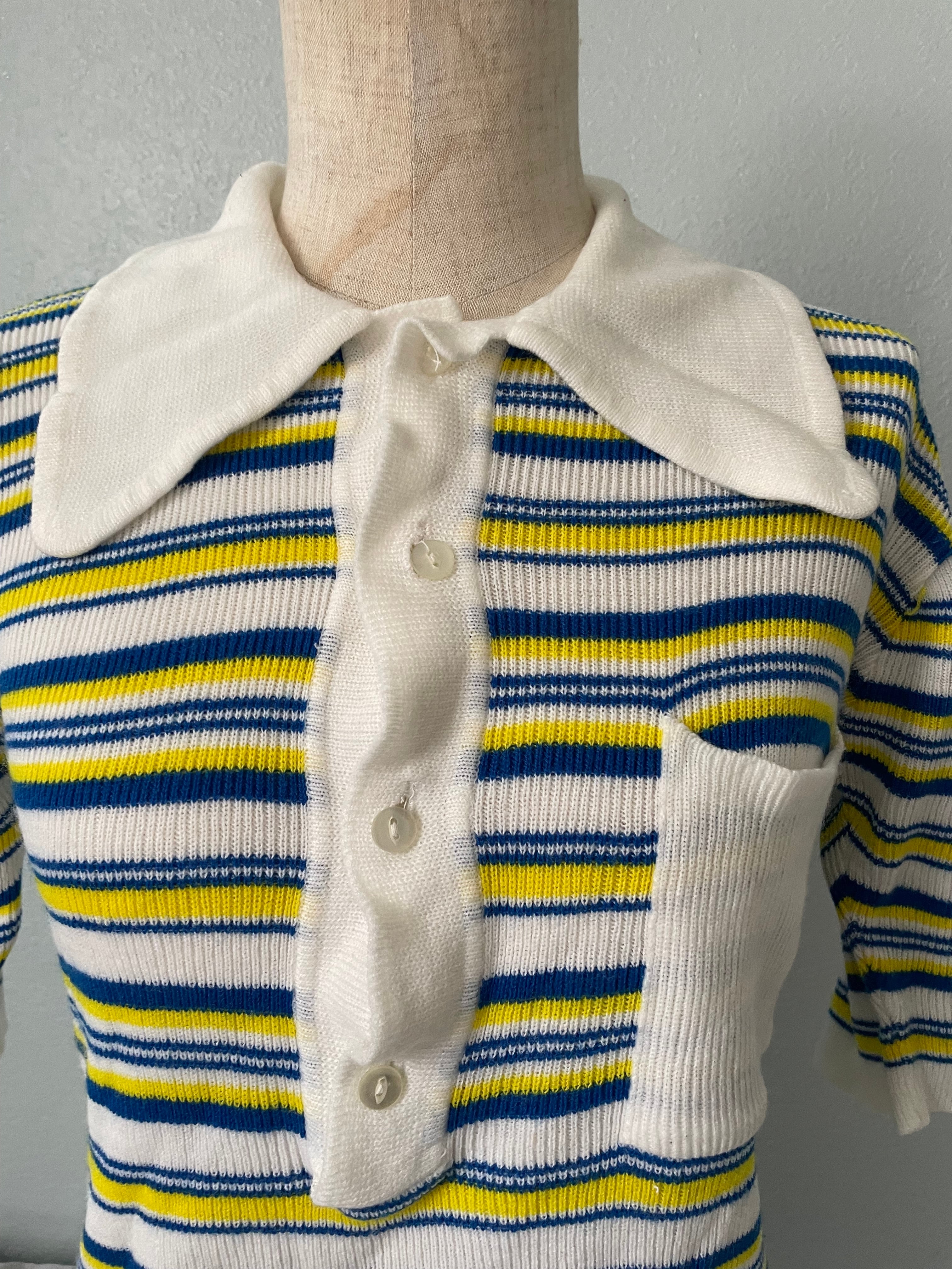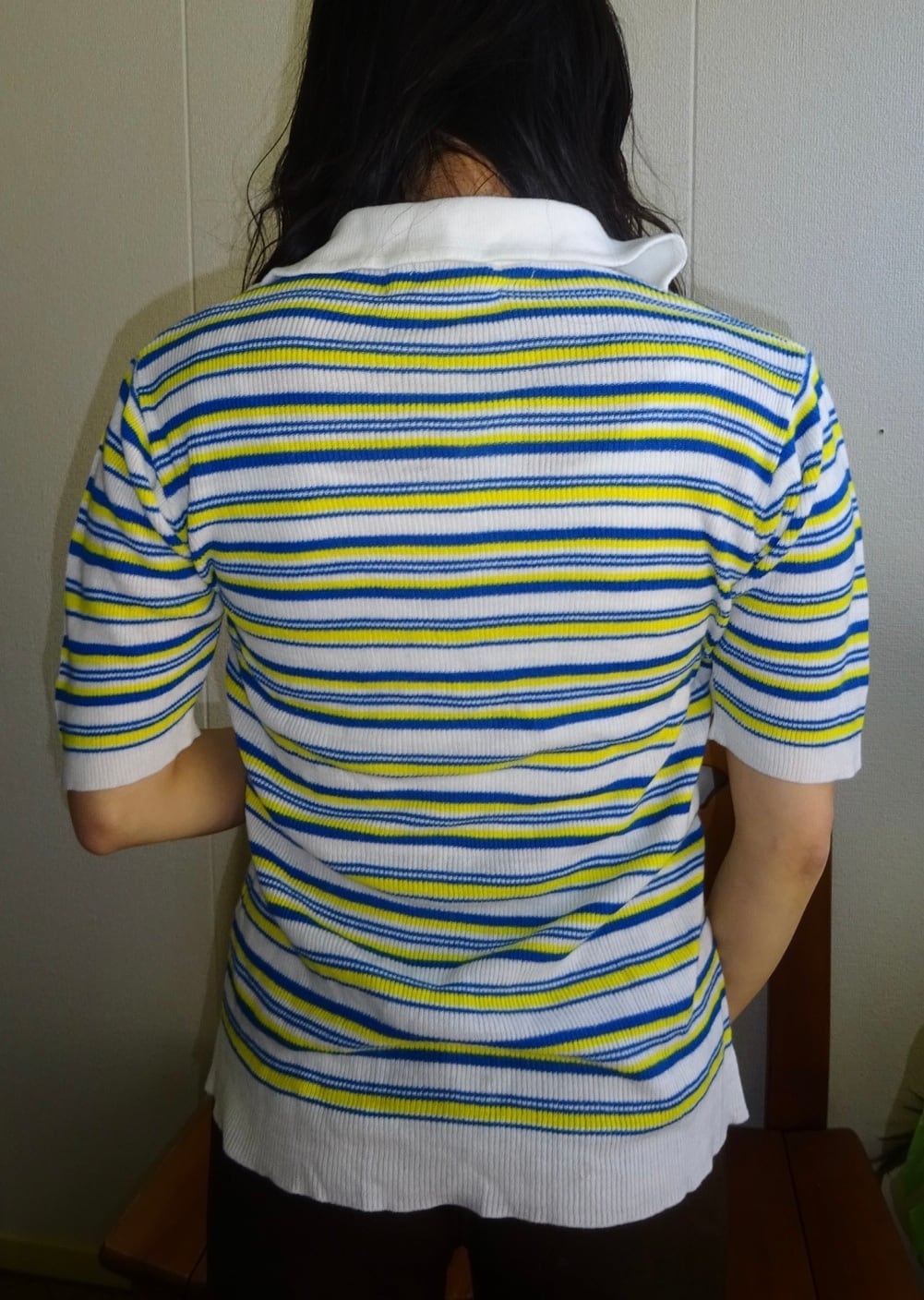 鮮やかなブルーとイエローのマルチボーダーが目を惹く、ヴィンテージニットポロ。