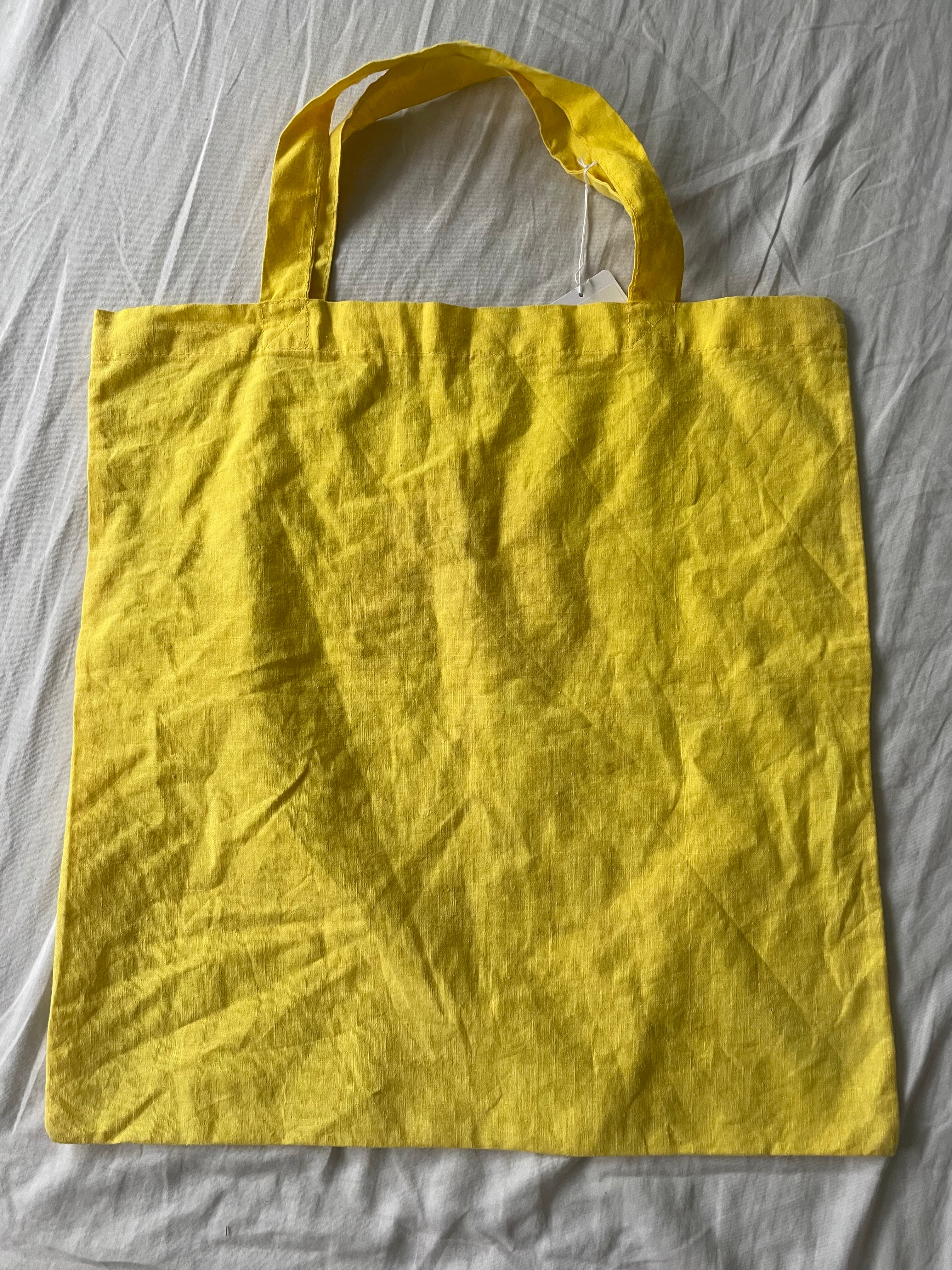鮮やかなイエローボディに、赤のツリープリントが映えるトートバッグ。